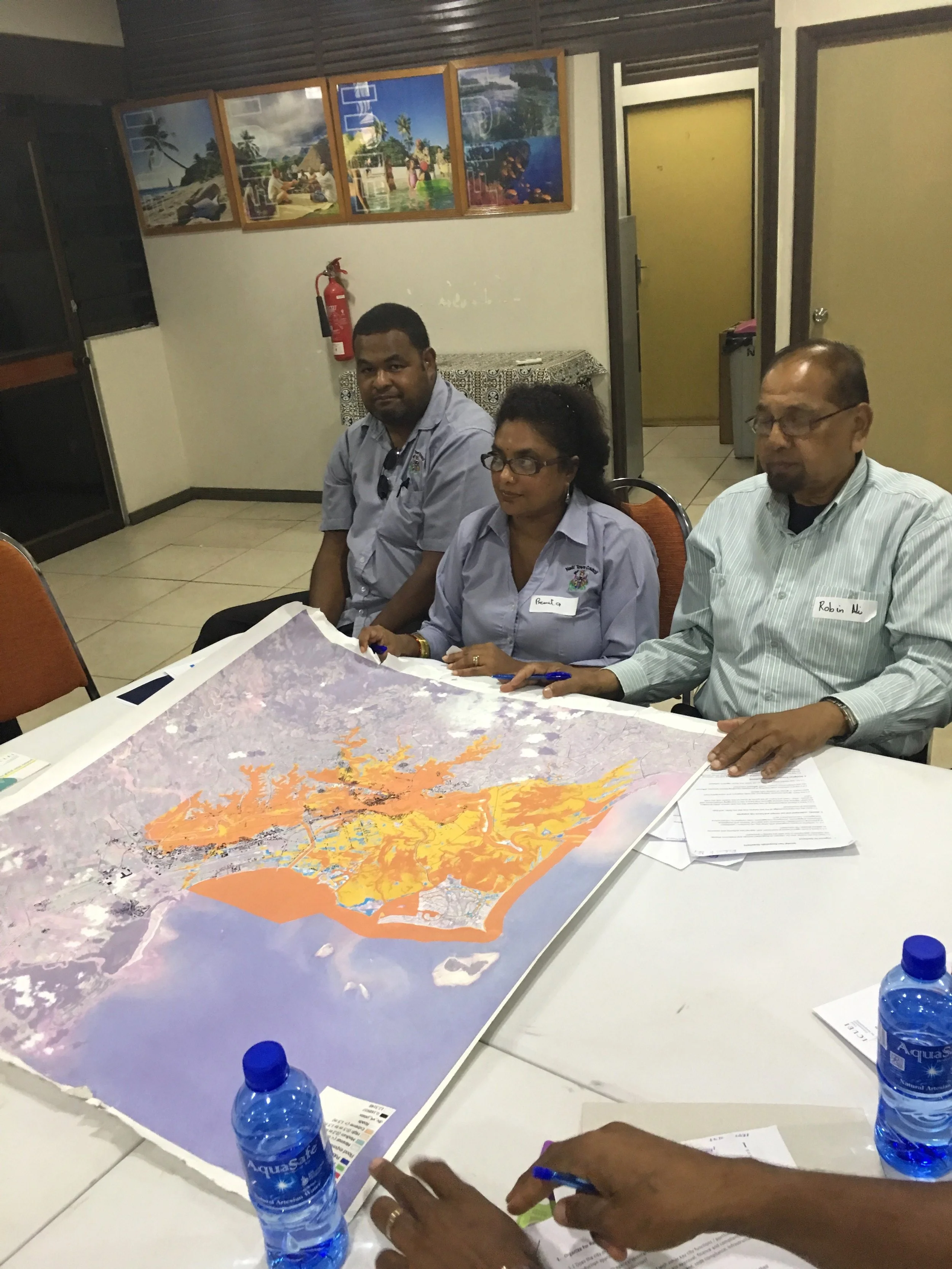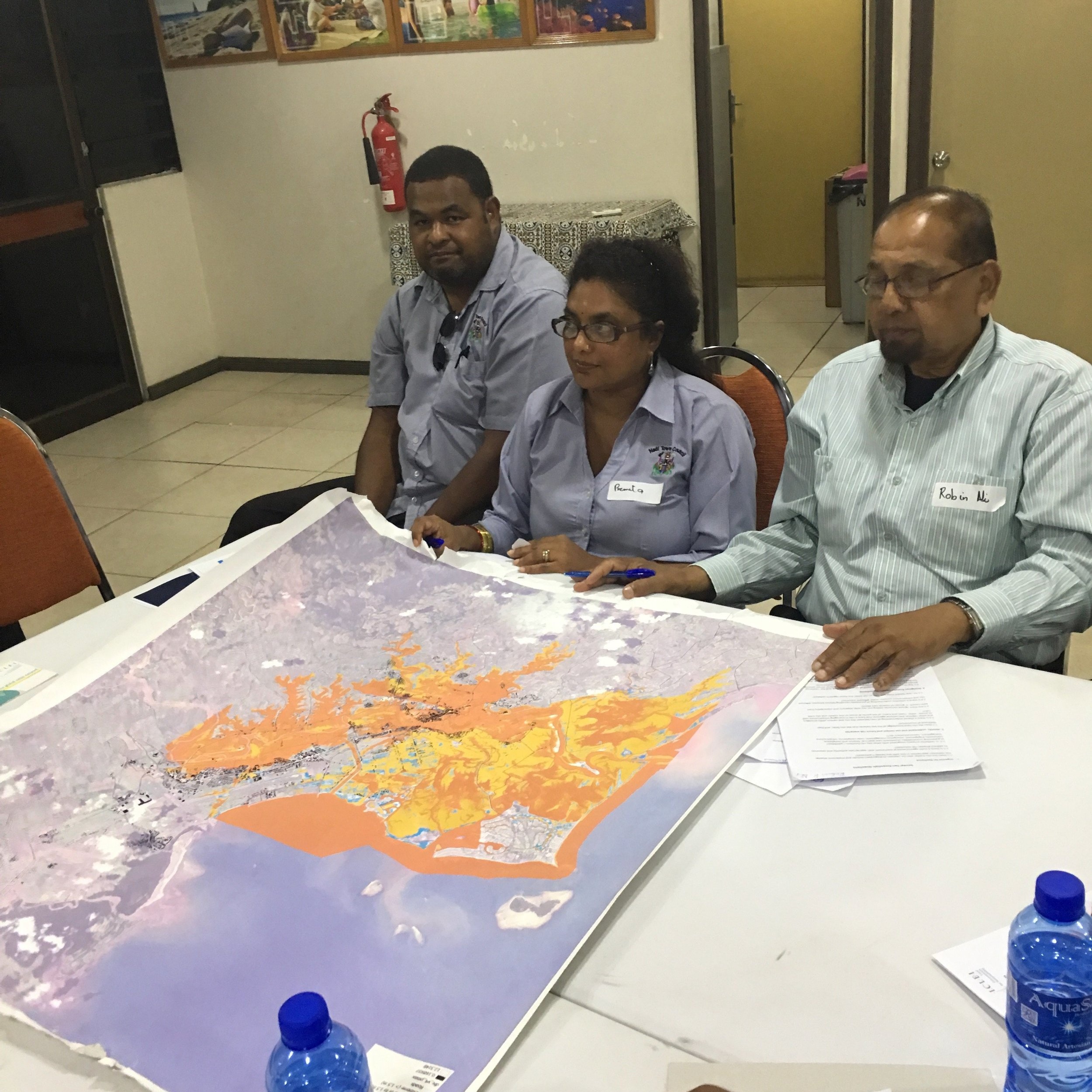 Image (by ICLEI Oceania): Special Administrator and Nadi Council staff mulling over the Nadi 1:100 year flood map