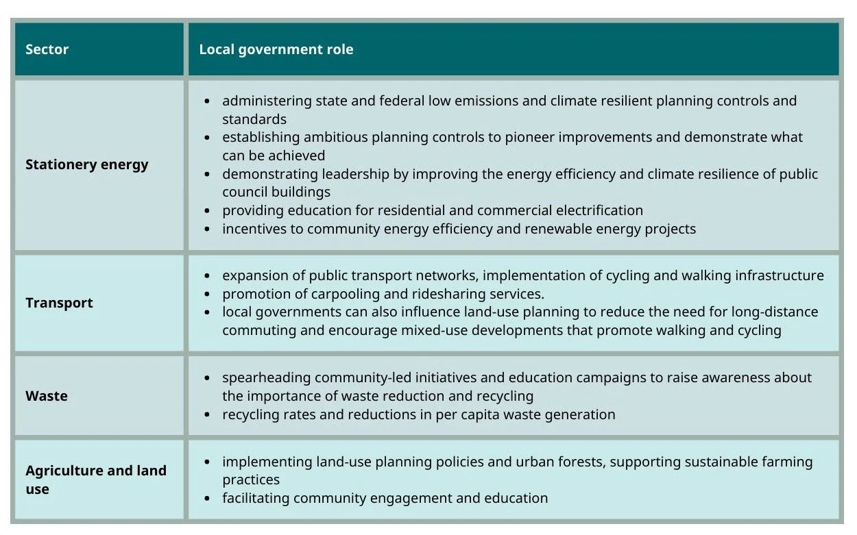 Councils are uniquely placed to abate greenhouse gases across emissions sectors in Australia’s Net Zero Plan through advocacy and behaviour change, urban planning and infrastructure development.