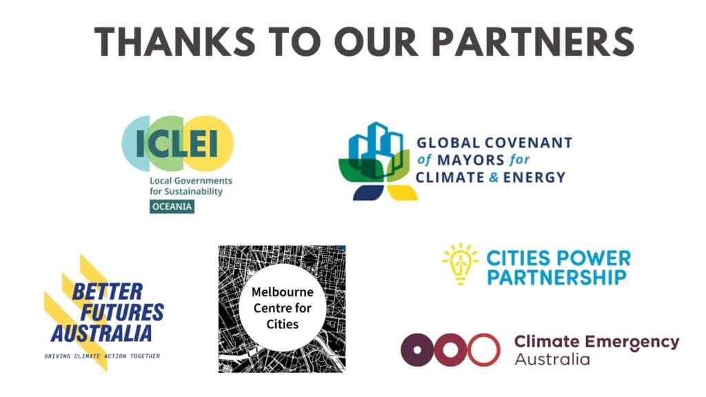 Supporters: Better Futures Australia, Climate Emergency Australia, Cities Power Partnership, Melbourne Centre for Cities, UN Habitat